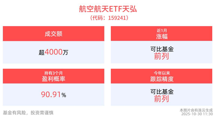 截至2025年10月30日午间收盘,航空航天ETF天弘(159241)回调蓄势,换手9.47%,成交4367.49万元。 跟踪指数成分股方面涨跌互现,国博电子(688375)领涨7.32%,中国卫星(600118)上涨3.79%,上海瀚讯 (300762)上涨2.96% 值得一提的是,航空航天ETF天弘(159241)盘中再获资金大举布局,截至目前,该基金净申购份额已达 400万份。 【更多产品】 | | 航空航天ETF天弘 159241 | ਐ | | --- | --- | --- | | | | △ 4 F | | 实时申购赎回信息 | 申购 | 赎回 | | 筆数 | 3 | 2 | | 金额 | O | O | | 份额 | 700万 | 300万 | 【产品亮点】 航空航天ETF天弘(159241)紧密跟踪国证航天指数,申万一级军工行业占比高达98.2%,堪称全市场"军 工纯度"最高的指数,覆盖航空装备、航天装备、卫星导航、新材料等关键产业链环节,成分股精选军 工领域头部企业,涵盖大飞机研制、低空经济、商业航天等新兴领域。" 【热点事件】 10月30日最新消息,神舟二十一号载人飞行任务新闻发布会在 ...