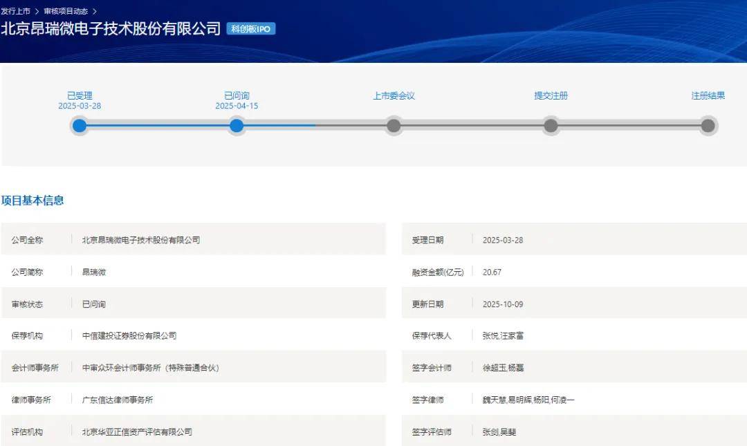 | 公司全称 | 北京易瑞微电子技术股份有限公司 | 受理日期 | 2025-03-28 | | --- | --- | --- | --- | | 公司简称 | 起步能 | 融资金额(亿元) | 20.67 | | 审核状态 | 已问询 | 更新日期 | 2025-10-09 | | 保存机构 | 中信建投证券股份有限公司 | 保存代表人 | 张倪 汪家量 | | 会计师事务所 | 中审众环会计师事务所(特殊普通合伙) | 签字会计师 | 徐超玉 杨聂 | | 律师事务所 | 广东信达律师事务所 | 签字律师 | 魏天盖,易明辉,杨阳 何凌一 | | 评估机构 | 北京华亚正信资产评估有限公司 | 签字评估师 | , 张剑 吴菲 | 据上交所消息,北京昂瑞微电子技术股份有限公司(简称:昂瑞微),科创板IPO申请将于10月15日上会审核,保荐机构为中信建投证券,保荐人代表 为:张悦、汪家富。 昂瑞微是一家国家级专精特新重点"小巨人"企业,深耕射频前端芯片、射频SoC芯片及模拟芯片领域。截至2025年6月,其累计未弥补亏损12.79亿元, 2022年至今扣非净利持续为负。且公司客户、供应商集中度较高,核心原料依 ...