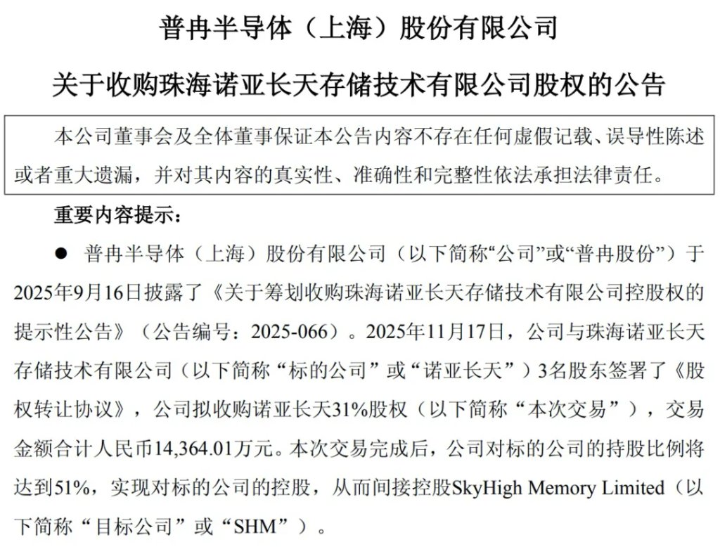11月17日晚间,普冉股份公告,公司拟以1.44亿元收购珠海诺亚长天存储技术有限公司(简称"诺亚长天")31%股权。交易完成后,公司对诺亚长天的持 股比例将达到51%,实现对诺亚长天的控股,从而间接控股SkyHigh Memory Limited(简称"SHM")。 51%控股诺亚长天 间接控股SHM 普冉股份披露,11月17日,公司与诺亚长天的3名股东珠海诺延、元禾璞华、横琴强科签署了《股权转让协议》,购买上述3名股东持有的诺亚长天总计 31%股权,交易金额合计1.44亿元。公司将以现金支付方式完成本次交易。 截至评估基准日,经资产基础法评估,标的公司母公司净资产账面值为44870.64万元,评估值46335.52万元,评估增值1464.88万元,增值率3.26%。 普冉股份表示,本次交易完成后,公司对诺亚长天的持股比例将达到51%,实现对诺亚长天的控股,从而间接控股SkyHigh Memory Limited(简 称"SHM")。 诺亚长天也具有较好的盈利能力。财务数据显示,诺亚长天2024年、2025年1-8月的营业收入分别为8.63亿元、6.87亿元;净利润分别为2374.74万元、 4749.34万 ...