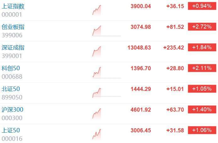 | 上证指数 | 3900.04 | +36.15 | +0.94% | | --- | --- | --- | --- | | 000001 | | | | | 创业板指 | 3074.98 | +81.52 | +2.72% | | 399006 | | | | | 深证成指 | 13048.63 | +235.42 | +1.84% | | 399001 | | | | | 科创50 | 1396.70 | +28.80 | +2.11% | | 000688 | | | | | 北证50 | 1444.29 | +15.01 | +1.05% | | 899050 | | | | | 沪深300 | 4601.92 | +63.70 | +1.40% | | 000300 | | | | | 上证50 | 3006.45 | +31.58 | +1.06% | | 000016 | | | | (责任编辑:宋政 HN002) 格隆汇10月21日|A股持续拉升,创业板指涨3%,上证指数涨近1%重回3900点,深成指涨近2%。 CPO、存储芯片、培育钻石、工程机械、苹果概念股涨幅居前,全市场超4300只个 ...