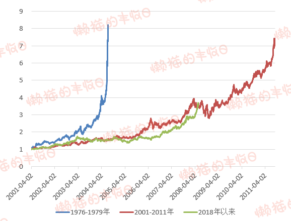 2001-2011年牛市,从256美元/盎司涨到1900美元/盎司,涨了7.4倍。 2018年以来,从1174美元/盎司最高涨到4381美元/盎司,已经涨了3.7倍。 如果对标前两轮牛市的话,这轮黄金牛市可能才走了一半,还有翻倍的潜力,不知道这一轮能不能看到? 果然没有只涨不跌的资产,稳如黄金,涨了2个月后也终于迎来深度调整,昨天跌6.1%,创了12年以来最大单日跌 幅。 是调整,还是行情见顶?从几张图入手,再了解下这轮黄金牛市。 (1)还可能涨多少? 金价自由浮动后,黄金经历了3轮大牛市。 1976-1979年牛市,从104美元/盎司涨到850美元/盎司,涨了7.2倍。 (来源:懒猫的丰收日) 转自:懒猫的丰收日 01 (2)牛市中的回撤 这是1976-1979年的最大回撤。 回撤10%是常规操作,隔一段时间就出现一次,1978年底甚至回撤了20%。 这是2001-2011年的最大回撤。 回撤10%也是常规操作。两次比较大的回撤:2006年5-6月回撤了22%,2008年回撤了29%。 这是2018年以来的最大回撤。 和前两轮牛市相比,有2个明显的不同:第一,常规回撤幅度变小,5%左右;第二,中途横盘时间拉 ...
