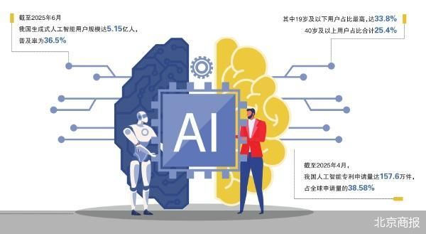 本报北京10月18日讯(记者李芃达)中国互联网络信息中心18日发布《生成式人工智能应用发展报告 (2025)》(以下简称《报告》)。《报告》显示,截至今年6月份,我国生成式人工智能用户规模达5.15亿 人,普及率为36.5%。 生成式人工智能应用场景持续拓展,探索实践日趋深入,助力各领域发展提质增效。截至今年8月 份,我国累计有538款生成式人工智能服务完成备案,263款生成式人工智能应用或功能完成登记。生成 式人工智能被广泛应用于智能搜索、内容创作、办公助手、智能硬件等多种场景,在农业生产、工业制 造、科学研究等领域得到积极探索。 据了解,我国持续加强人工智能基础研究,同时突出应用导向,推动生成式人工智能技术不断向具 体应用场景纵深渗透。产业体系更加完备。目前,我国已形成覆盖基础层、框架层、模型层、应用层的 完整人工智能产业体系,产业链覆盖芯片、算力、数据、平台、应用等各相关环节;专利数量全球领 先。随着技术环境不断优化,我国在全球人工智能技术领域的话语权持续增强,已成为推动全球人工智 能技术创新的重要力量。截至今年4月份,我国人工智能专利申请量达157.6万件,占全球申请量的 38.58%,位居全球之首。 ...