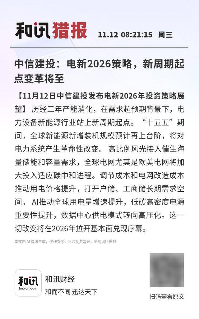 本文由 Al 算法生成,仅作参考,不涉投资建议,使用风险自担 和讯财经 和而不同 迅达天下 【11月12日中信建投发布电新2026年投资策略展望】历经三年产能消化,在需求超预期背景下,电力设 备新能源行业站上新周期起点。"十五五"期间,全球新能源新增装机规模预计再上台阶,将对电力系统 产生革命性改变。高比例风光接入催生海量储能和容量需求,全球电网尤其是欧美电网将加大投入适应 碳中和进程。调节成本和电网改造成本推动用电价格提升,打开户储、工商储长期需求空间。AI推动 全球用电量增速提升,低碳高密度电源重要性提升,数据中心供电模式转向高压化。这一切改变将在 2026年拉开基本面兑现序幕。 本文由 AI 算法生成,仅作参考,不涉投资建议,使用风险自担 和讯猎报 11.12 08:21:15 ■三 中信建投:电新2026策略,新周期起 点变革将至 【11月12日中信建投发布电新2026年投资策略展 望】历经三年产能消化,在需求超预期背景下,电 力设备新能源行业站上新周期起点。"十五五"期 间,全球新能源新增装机规模预计再上台阶,将对 电力系统产生革命性改变。高比例风光接入催生海 量储能和容量需求,全球电网尤其是欧美电 ...