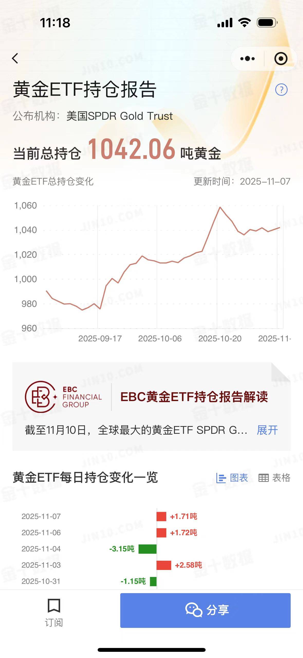黄金ETF持仓量报告解读(2025-11-11)金价高开高走 破4100关口