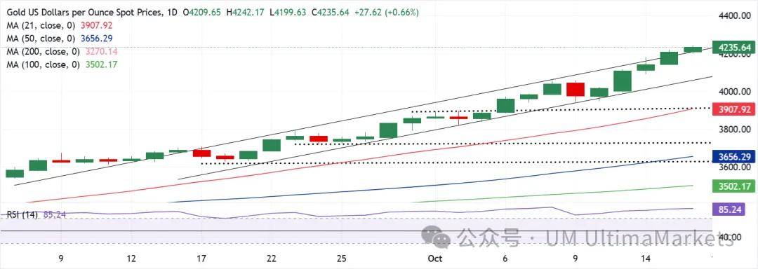 黄金价格表现 - 黄金价格在2025年10月16日延续创纪录上涨,连续第四天上涨,并于周三收盘突破4200美元门槛,达到4184美元 [1][3][12] - 价格短期目标为4250美元的心理关口,突破后可能进一步上探4300美元 [13] - 若出现回调,前一天低点4140美元可能提供暂时支撑,关键通道支撑位在4062美元 [14][15] 驱动因素分析 - 美元持续走弱以及对避险资产的持续需求是推动黄金上涨的主要因素 [2][4] - 中美贸易争端持续以及美国政府停摆带来的经济不确定性,打击市场对美元信心,促使投资者转向黄金 [4] - 市场预期美联储在10月和12月货币政策会议上降息的概率约为95%,对无收益黄金形成支撑 [6][7] 技术指标分析 - 14天相对强弱指数(RSI)处于严重超买状态,目前接近85,显示市场存在获利回吐风险 [2][12] - 黄金价格在日线图上已突破一个月上升通道的上边界,但该形态的自然趋势是向下突破,上升趋势的持续性尚不确定 [12]