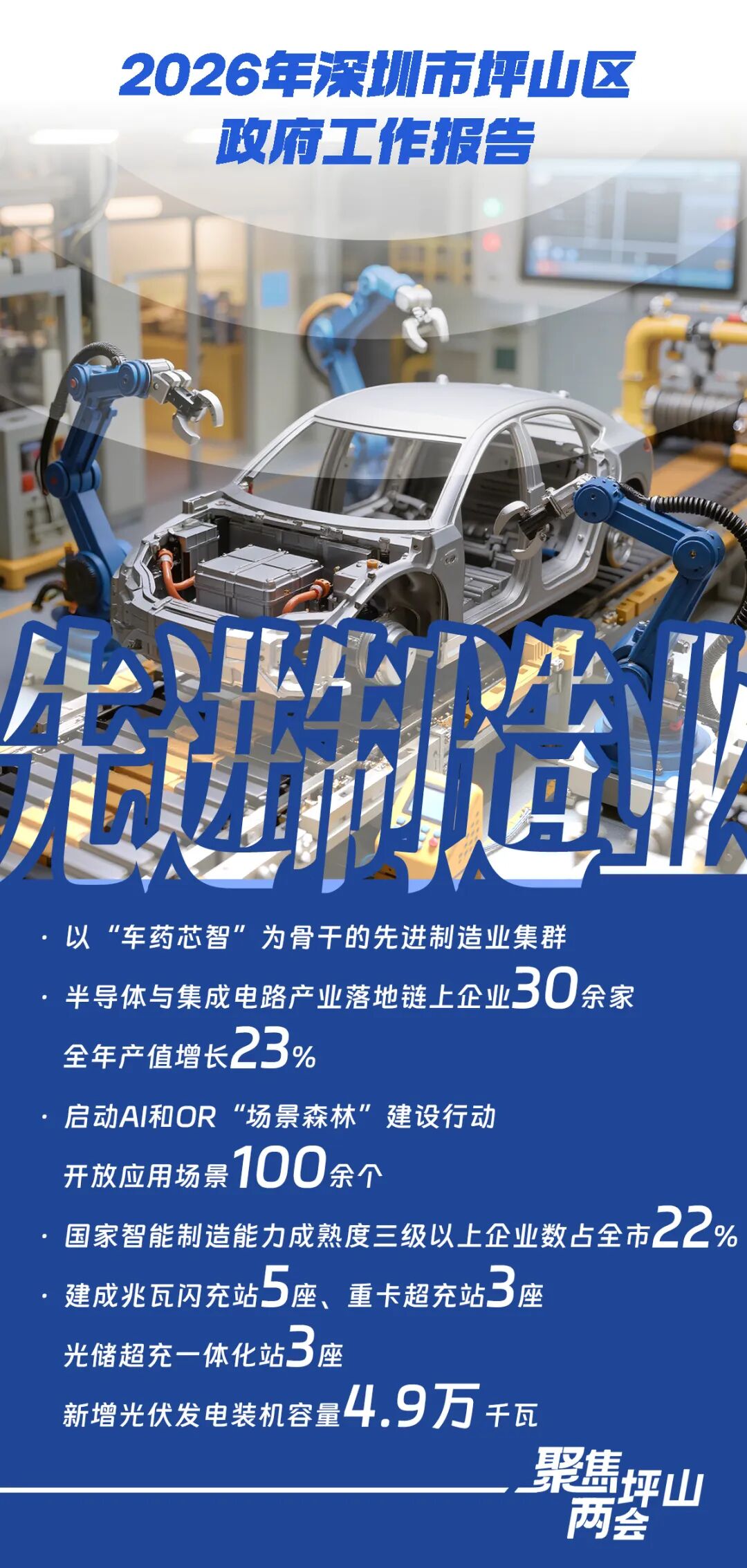 宏观经济与产业发展 - 全年产值增长5% [2] - 新增光伏发电装机容量4.9万千瓦 [3] - 整备工业用地20万平方米,释放产业空间1平方公里,新增产业空间180万平方米 [9] - “种草式”招商引进项目近600个,意向投资额超300亿元 [10] - 综合保税区进出口总额增速排名主市前列 [18] 新能源与绿色基础设施 - 建成兆瓦闪充站二座、重卡超充站二座,光储超充一体化站5座 [5] - 完成全省唯一国家级新污染物治理试点任务,优良河流长度占比提升至98.5% [21] 科技创新与知识产权 - 启动AI和OR“场景森林”建设行动,开放应用场景100余个 [5] - 国家智能制造能力成熟度三级以上企业数占全市一定比例 [5] - 北京理工大学深圳汽车研究院被认定为国家级、全市唯一产业知识产权运营中心,全市首个新能源汽车产业知识产权创新联合体成立 [13] - PCT国际专利申请量增长37% [13] - 战略科学家等高层次人才增长13.6%,博士人才增长21.4% [13] - 推出54项改革举措,“改革赋能产业发展”经验入选全国“全面深化改革重点研究名单” [16] - AI赋能基层治理获评“中国人工智能+城市治理”优秀案例,党建引领居民小区多元协同共治改革经验入选《中国改革年鉴》 [16][17] - 出台全国首个区县级创新药专项支持政策 [32] 现代服务业与消费 - 文体娱乐业营业收入增长19% [6] - 限额以上零售业销售额增长38% [7] - 软件和信息技术服务业营业收入增长39% [7] - 新开业商业综合体3个,坪山万象项目启动建设 [21] 低空经济与特色产业 - 新增低空起降点53个,推出低空、工业等特色旅游路线40余条,带动低空经济产业产值增长50% [7] 城市建设与交通 - 高水平完成中心区规划及核心区城市设计 [21] - 建成公园15个,远足径郊野径总里程突破100公里 [21] - 坪山高铁站升级为深圳东部综合交通主枢纽 [30] - 地铁19号线一期、深惠城际大鹏支线、深大城际、东部过境通道、外环高速三期等加快建设 [30] - 20条道路建成,4条断头路顺利打通,新增非机动车道超300公里,新增停车泊位1.2万余个 [30] 社会事业与民生 - 建成投用多所公办中小学和幼儿园,新增基础教育学位8130个,获评全国义务教育优质均衡发展区、学前教育普及普惠区 [23] - 完成社康机构标准化改造多家,“10分钟社康圈”基本建成 [23] - 马峦山戏剧创排中心投入运营,新增城市书房14家 [26] - 拥有1.5万座的体育公园开工建设,“深圳街超”蝉联“深圳十大特色体育赛事” [26]