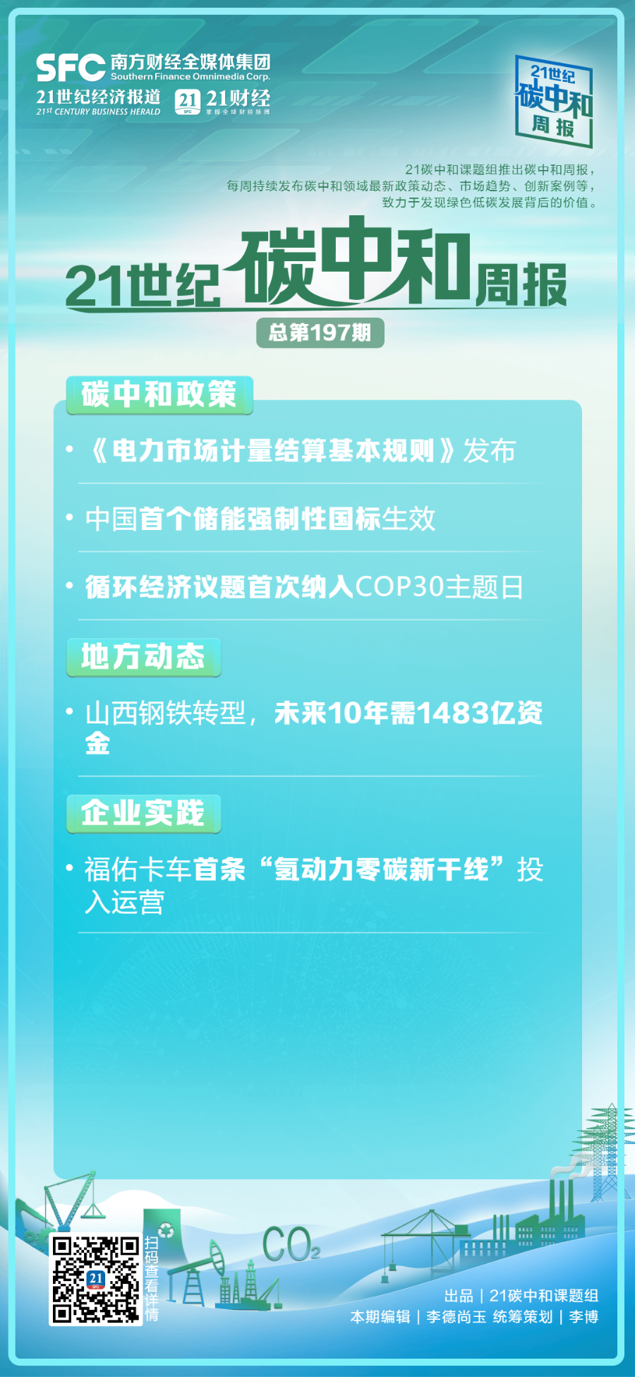 碳中和政策 - 《电力市场计量结算基本规则》发布,共6章56条,规范计量管理、结算管理等内容,首次明确用户侧与电网企业电费收付流程要求 [1] - 规则重点加强计量业务管理、规范结算业务管理、强化结算风险管理、统一电费收付要求四方面内容 [1] - 中国首个储能强制性国标GB 44240-2024生效,适用于电能存储系统用锂蓄电池和电池组,新增多项安全测试项目 [3] - 循环经济议题首次纳入COP30主题日,11月10日至11日将聚焦适应、城市、基础设施、水、废物、循环经济等主题 [4] 地方动态 - 山西钢铁行业未来10年需1483亿资金支持转型,重点推广短流程、氢冶金等先进工艺技术 [4] - 2024年山西粗钢产量6027.90万吨,占全国6%,2023年钢铁行业营收占全省工业11.5% [4] 企业实践 - 福佑卡车首条"氢动力零碳新干线"投入运营,全程450公里,途经德州、济南、潍坊、青岛等地 [5] - 福佑卡车计划与新能源主机厂、加氢站运营方合作,推动氢能重卡研发创新和数字生态平台建设 [6]
