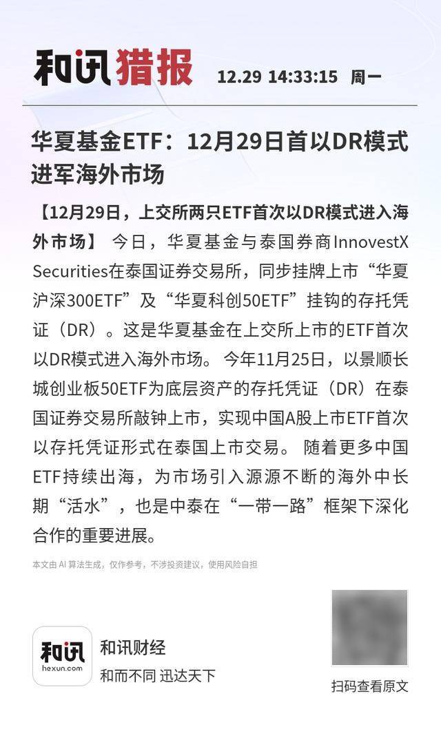 产品与市场动态 - 华夏基金旗下两只在上交所上市的ETF——华夏沪深300ETF及华夏科创50ETF,首次以存托凭证(DR)模式在泰国证券交易所挂牌上市 [1] - 此前于今年11月25日,以景顺长城创业板50ETF为底层资产的存托凭证(DR)已在泰国证券交易所上市,实现了中国A股上市ETF首次以该形式在泰国交易 [1] 行业趋势与影响 - 中国ETF产品正持续向海外市场拓展,为A股市场引入海外中长期资金 [1] - 中国ETF以DR形式在泰国上市,是“一带一路”框架下中泰两国深化金融合作的重要进展 [1]