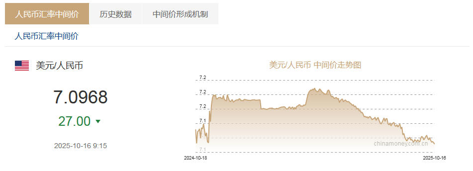 中国人民银行授权中国外汇交易中心公布,2025年10月16日银行间外汇市场人民币汇率中间价为:1美 元对人民币7.0968元,1欧元对人民币8.2755元,100日元对人民币4.7077元,1港元对人民币0.91295元, 1英镑对人民币9.5210元,1澳大利亚元对人民币4.6215元,1新西兰元对人民币4.0644元,1新加坡元对 人民币5.4854元,1瑞士法郎对人民币8.9163元,1加拿大元对人民币5.0581元,人民币1元对1.1288澳门 元,人民币1元对0.59517马来西亚林吉特,人民币1元对11.0413俄罗斯卢布,人民币1元对2.4430南非兰 特,人民币1元对199.70韩元,人民币1元对0.51694阿联酋迪拉姆,人民币1元对0.52789沙特里亚尔,人 民币1元对47.1830匈牙利福林,人民币1元对0.51380波兰兹罗提,人民币1元对0.9026丹麦克朗,人民币 1元对1.3330瑞典克朗,人民币1元对1.4206挪威克朗,人民币1元对5.88715土耳其里拉,人民币1元对 2.5995墨西哥比索,人民币1元对4.5699泰铢。 10月16日,人民币兑美元中间价上调27个基点, ...