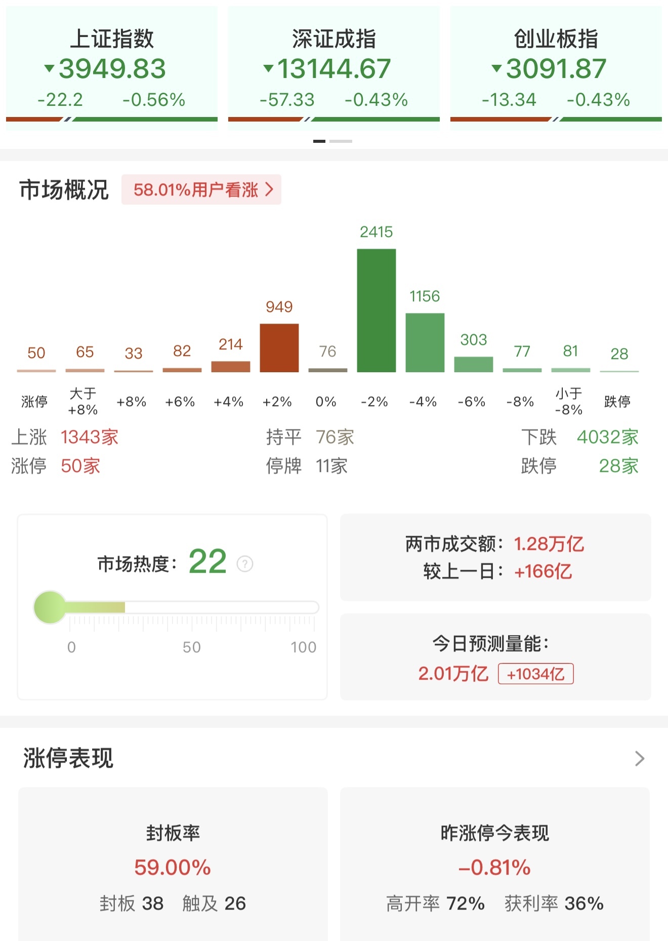 11月18日,市场早盘震荡调整,深成指、创业板指翻红后再度回落。 涨停表现 | 封板率 | 昨涨停今表现 | | --- | --- | | 59.00% | -0.81% | | 封板 38 触及 26 | 高开率 72% 获利率 | 沪深两市半日成交额1.28万亿,较上个交易日放量166亿。盘面上热点较为杂乱,全市场超4000只个股下跌。 从板块来看,AI应用概念大涨,榕基软件、浪潮软件2连板,宣亚国际等10余股涨停。半导体概念表现活跃,同益股份20cm涨停,龙迅股份涨停。机器人概 念股局部走强,首开股份5天3板。下跌方面,福建、锂电池等热门板块集体下挫。其中福建板块重挫,福建金森、福建水泥等多股跌停。锂电池板块震荡走 弱,石大胜华跌停。 板块方面,AI应用、半导体等板块涨幅居前,煤炭、电池、钢铁等板块跌幅居前。截至收盘,沪指跌0.56%,深成指跌0.43%,创业板指跌0.43%。 ...