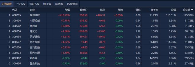 市场整体表现 - 市场早盘探底回升,三大指数集体翻红,沪指涨0.08%,深成指涨0.39%,创业板指涨0.47% [1] - 全市场超3500只个股上涨,盘面上热点快速轮动 [1] - 沪深两市半日成交额9927亿元,较上个交易日缩量394亿元 [3] 领涨板块与个股 - 福建板块持续爆发,海欣食品8天7板,安记食品、太阳电缆双双4连板,舒华体育2连板 [1] - 算力硬件概念快速走强,长光华芯20cm涨停创历史新高 [1] - 商业航天概念股延续强势,顺灏股份6天5板,龙洲股份3连板 [1] - 人形机器人概念表现活跃,骏亚科技3连板,中坚科技涨停 [1] 下跌板块与个股 - 银行板块震荡走弱,重庆银行跌超3% [2] 个股成交活跃度 - 个股成交额方面,摩尔线程成交额超125亿元居首,中际旭创、新易盛、寒武纪成交额靠前 [3] - 摩尔线程股价上涨416.79%,成交额达125.92亿元 [4] - 中际旭创股价上涨0.15%,成交额达91.76亿元 [4] - 新易盛股价上涨0.70%,成交额达91.34亿元 [4] - 寒武纪股价上涨1.68%,成交额达88.16亿元 [4] - 天孚通信股价上涨5.61%,成交额达87.39亿元 [4] - 航天发展股价上涨4.22%,成交额达81.04亿元 [4] - 三花智控股价上涨0.13%,成交额达65.50亿元 [4] - 阳光电源股价上涨3.10%,成交额达63.87亿元 [4] - 和而泰股价下跌9.32%,成交额达59.50亿元 [4] - 胜宏科技股价上涨0.73%,成交额达57.47亿元 [4]