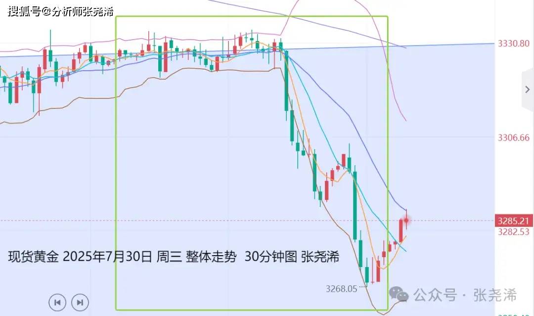张尧浠:鲍威尔淡化降息预期、金价坠落百日线先看反弹 上交易日周三(7月30日):国际黄金遇阻回落再度走低,空头力量加大,跌破趋势支撑,如期进一步触及100日均支撑位置,可先行看反弹,如重回3300关 口上方,则加大反弹动力,有望再度上探3400美元乃至突破阻力;如回落跌破100日均线持稳收线,则有望继续走低触及3100或3000美元关口位置。 具体走势上,金价自亚市开于3326.73美元/盎司,亚欧盘整体维持前两日的震荡上升模式发展,并来回多空不断收割,且在欧盘时段录得日内高点3334.02 美元,之后美盘开盘后,空头力量加大,连续坠落走低于盘尾录得日内低点3267.97美元,最终受到百日均线支撑有所止跌,最终收于3274.82美元,日振 幅66.05美元,收跌51.91美元,跌幅1.56%。 影响上,由于美国经济数据强劲,美国7月ADP就业人数创3月以来最高增速,美国二季度经济增长3%等,以及美联储按兵不动,鲍威尔避免就9月降息给 出指引,坚持观望立场,美元指数连续第五个交易日上涨,打压金价走低收跌。 展望今日周四(7月31日):国际黄金开盘先行止跌反弹,受到百日均线支撑的买盘推动,以及美国再挥关税大棒,威 ...
