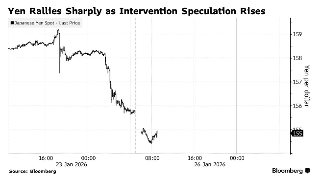 日元汇率近期走势与市场动态 - 日元兑美元汇率在周一亚洲早盘一度上涨近1%至154.23,创下一个多月以来最高水平 [1] - 日元涨势源于日本首相高市早苗对市场的警告以及上周五美国可能加入共同干预的信号 [1] - 上周五日元最高上涨1.75%,创下自8月1日以来的最大单日涨幅 [2] 日本政府干预立场与行动 - 日本首相高市早苗表示政府将采取一切必要措施应对投机性和极度异常的市场波动 [1] - 日本财务大臣已明确可根据需要自主采取包括汇市干预在内的行动 [1] - 相较于往届政府,高市早苗政府对汇市投机性波动的容忍度要低得多 [3] - 2024年日本政府为支撑日元累计投入近1000亿美元开展购汇操作 [5] 市场对干预的预期与反应 - 交易员对日本政府的汇市干预行动保持高度警惕 [1] - 纽约联储联系多家金融机构核查日元汇率的消息,让交易员认为日美存在联合干预的可能性 [1][2] - 汇率核查通常是采取实际干预行动前的最后警示,或将迫使大量日元空单平仓 [3] - 市场判断日元兑美元触及160关口是日本或再度干预的关键参考价位 [5] 潜在联合干预及其历史背景 - 日美两国若采取协同干预行动,令人联想到1985年的《广场协议》 [5] - 自1996年以来美国仅三次介入汇市,最近一次是2011年日本大地震后与G7联手抛售日元 [5] - 日美协调干预、达成类似‘第二次广场协议’的结果,对部分市场参与者而言已不再是天方夜谭 [5] - 若日美同时入市干预,将是双边协调的一次罕见公开体现 [6] 日本国内政治与宏观经济背景 - 日本正为2月8日的众议院提前大选做准备,高市早苗承诺下调食品消费税 [8] - 在2月众议院提前大选前,160日元兑美元关口会被视作重大危机指标 [8] - 日本40年期国债收益率一举突破4%,创该品种上市以来新高,也是所有期限国债三十多年来的收益率新高 [8] - 在当前财政支出扩张的宏观环境下,汇市干预只能延缓日元贬值趋势,无法从根本上扭转局面 [8] 其他相关市场动态 - 受美元走弱提振需求影响,黄金上涨0.8%至每盎司5029.05美元,延续了上周累计8.5%的上涨势头 [1] - 外汇市场的剧烈波动与日本国债市场的动荡相伴而生,日本超长期国债收益率上周初一度飙升至历史新高 [3]