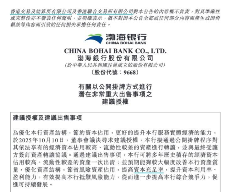 文章核心观点 - 商业银行不良资产处置步伐持续提速,渤海银行拟挂牌转让近500亿元本金债权资产,总规模近700亿元 [1] - 在经济下行压力与房地产风险持续释放的背景下,银行正通过高频次、大规模资产剥离加速优化资产结构 [1][3] - 不良资产处置市场呈现单笔规模更大、参与主体更多元、处置周期缩短及平均折扣率下探等新趋势 [7][8][9] 渤海银行不良资产处置详情 - 拟转让174户债权,本金合计499.37亿元,叠加利息104.36亿元、罚息93.34亿元及代垫费用1.26亿元,债权总额近700亿元 [2] - 转让初步最低代价总额不低于488.83亿元,相当于债权总额约7折,主要为贷款债权,涉及本金318.78亿元 [2] - 按账龄划分,3至5年及5年以上债权金额近428亿元,旨在一次出清历史积存的高资本占用、低流动性资产 [2] - 此次为连续第二年大规模剥离,2024年7月曾以207.24亿元(约7折)转让53户256.05亿元本金债权予天津津融资管 [3] - 通过出售可改善资产质量,节省风险资产占用,提高资本充足率及盈利能力 [2] - 截至2025年6月末、2024年6月末和2023年6月末,不良贷款余额分别为172.69亿元、171.12亿元和175.53亿元,不良率稳定在1.81%至1.84% [4] - 2023年末、2024年末、2025年6月末通过现金清收、核销、转让等方式处置不良资产分别为187.98亿元、355.34亿元和37.42亿元 [6] 行业不良资产处置趋势 - 百亿元及以上规模银行债权挂牌转让愈加密集,处置理念优化,渠道多元化以提高效率 [7] - 参与主体多元:出让方除银行外,消费金融、信托、租赁等非银机构占比提升;受让方除四大AMC,地方AMC及民营资本重要性突出 [7][8] - 处置周期缩短,未诉即售、短账龄(逾期一年以下)不良资产包增多,因诉讼催收成本高且银行主动提升信贷资源周转效率 [8] - 平均折扣率持续下探,部分区域抵押物充足资产包流拍加剧,因底层资产多为信用卡、消费贷等无抵押贷款,回收预期低 [9] - 估值逻辑变化,变现效率成定价关键,部分不动产抵押物因估值下行或产权瑕疵影响成交 [9] - 市场供需失衡,个贷不良挂牌规模激增压低价格,地方AMC受融资成本制约更倾向短期周转,长周期资产接手意愿降低 [9]