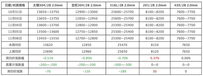 本周市场回顾 - 不锈钢市场趋弱调整,市场观望态势提升 [1] - 无锡地区太钢304冷卷价格在13450-13550元/吨,周环比下跌200元/吨或1.46%,年同比下降5.92% [1] - 无锡地区宏旺304冷卷价格在12700-12800元/吨,周环比下跌200元/吨或1.54%,年同比下降6.59% [1] - 从周均价看,太钢304冷卷均价为13620元/吨,较前一周下跌70元/吨或0.51% [1] - 从周均价看,宏旺304冷卷均价为12850元/吨,较前一周下跌110元/吨或0.85% [1] - 316L/2B周均价下跌180元/吨或0.70%,201/2B周均价上涨30元/吨或0.37%,430/2B周均价持平 [2] 市场驱动因素 - 不锈钢期货震荡下行,宏观情绪谨慎,原料及成品价格承压 [4] - 需求不及预期,社会库存水平小幅提升 [4] - 市场避险情绪提升,201成品挺价情绪提升,价格部分小幅上扬 [4] - 终端市场按需补货为主 [4] 供应与成本分析 - 市场去库节奏缓慢,钢厂分货刚结束,市场存在陆续到货预期 [6] - 成本下行拖累指导价格下调,增加后市货源消化难度,供应端压力预期有增无减 [6] - 原料价格弱势,但成品价格持续下探后成本支撑凸显,原料进一步下行空间有限 [6] 需求分析 - “银十”表现不及业者预期,需求面无明显起色 [6] - 短期需求难有增量,关注中间商环节备货情况 [6] - 需求面短期继续维持疲软预期 [6] 下周市场展望 - 市场供需改善不理想,成交难以有效突破 [5] - 11月排产减产主要集中在200系,300系及400系减产预期有限,后续供需矛盾突出 [5] - 成本开始提供支撑,成品进一步下调空间有限,短期或回归区间震荡整理 [5] - 相关产品普遍性下行至阶段性低点,市场商家保持让利出货,短期价格面低位整理,观望反弹为主 [6]