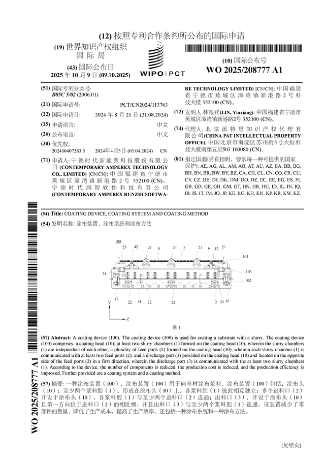 宁德时代公布国际专利申请:“涂布装置、涂布系统和涂布方法”
