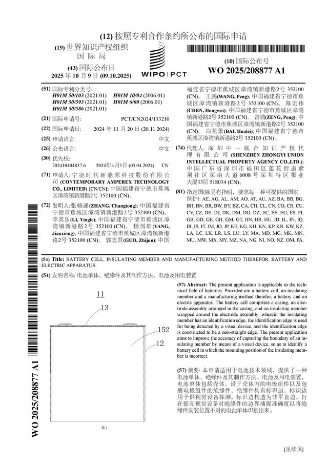宁德时代公布国际专利申请:“电池单体、绝缘件及其制作方法、电池及用电装置”
