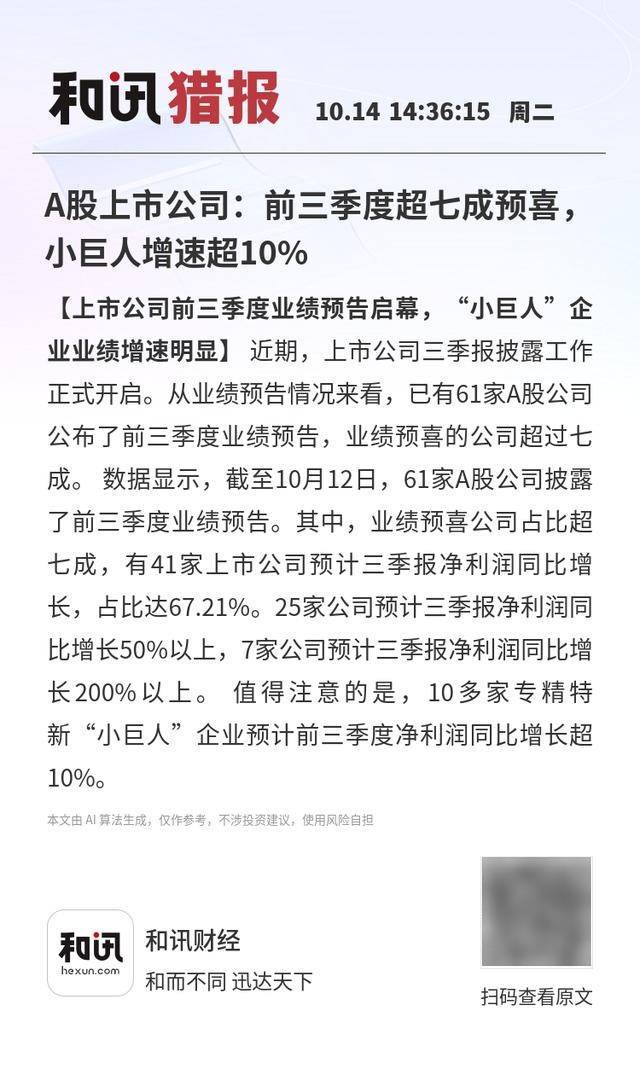 上市公司三季报披露开启 - 上市公司三季报披露工作正式开启 [1] - 截至10月12日已有61家A股公司公布前三季度业绩预告 [1] 业绩预喜公司概况 - 业绩预喜公司超过七成 [1] - 41家上市公司预计三季报净利润同比增长占比达67.21% [1] - 25家公司预计三季报净利润同比增长50%以上 [1] - 7家公司预计三季报净利润同比增长200%以上 [1] 专精特新“小巨人”企业表现 - 10多家专精特新“小巨人”企业预计前三季度净利润同比增长超10% [1]