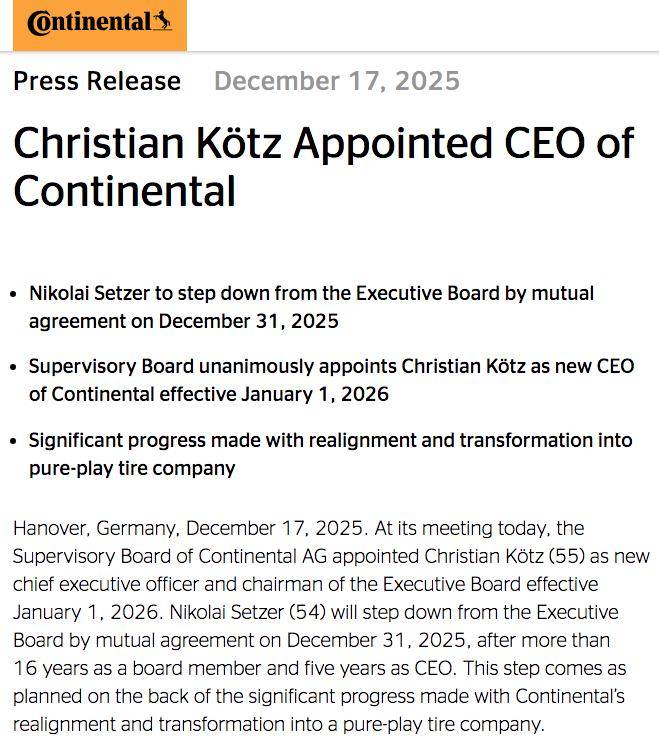 12月17日,德国知名汽车零部件和轮胎制造商大陆集团宣布,大陆集团监事会称,现任CEO司徒澈(Nikolai Setzer)将于2025年12月31日卸任。司徒澈卸 任后,将由克里斯蒂安·科茨(Christian Kötz)担任新任CEO兼执行董事会主席,该任命将于2026年1月1日起生效。 也就是说,按照计划,Nikolai Setzer的任期原本将持续至2029年3月底,此次属于提前卸任。大陆集团表示,基于双方协商,Nikolai Setze将于2025年12月 31日卸任执行董事会职务。同时大陆集团称,本次人事变动是在大陆集团重组和转型为纯轮胎公司取得重大进展的基础上按计划进行的。 新任CEO兼执行董事会主席的克里斯蒂安·科茨现年55岁,其自1996年以来一直在大陆集团的轮胎业务中担任多项职务。自2019年以来担任执行委员会成 员,曾领导轮胎集团部门的关键领域,包括乘用车轮胎(EMEA)的更换业务、原始设备和商用车轮胎业务部门以及乘用车轮胎的全球研发。 资料显示,大陆集团前身是创立于1871年的橡胶制造商,总部位于德国汉诺威,是德国运输行业制造商,也是世界第四大轮胎制造商,拥有汽车、轮胎、 康迪泰克、合 ...