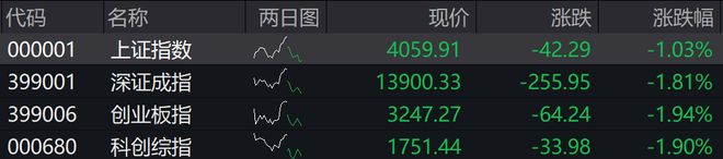 市场整体表现 - 截至午盘,A股三大指数均跌超1%,沪指跌1.03%报4059.91点,深成指跌1.81%报13900.33点,创业板指跌1.94%报3247.27点,科创综指跌1.90%报1751.44点 [1][2] - 市场开盘即集体低开,上证指数低开0.66%,深证成指低开0.96%,创业板指低开1.02%,科创综指低开1.60% [9][10] - 沪深两市半日成交额1.45万亿元,较上个交易日缩量1682亿元,全市场近3700只个股下跌 [3] - 港股同步走弱,恒生指数低开0.82%,恒生科技指数跌1.31% [11][12] 行业板块表现 - **下跌板块**:光伏产业链全面下挫,黄金、基本金属、煤炭、半导体、算力硬件概念股明显回调领跌 [2][7] - **上涨板块**:两岸融合、短剧游戏、零售题材逆势走强,银行板块盘初局部走强 [2][8] - **具体行业动态**: - 影视院线板块持续走强,金逸影视涨停,横店影视封板,幸福蓝海涨超10%,多部影片定档春节 [3] - 短剧游戏板块盘初上扬,遥望科技、浙文影业涨停 [7] - 有色金属板块持续下探,晓程科技跌逾10%,湖南黄金、四川黄金等多股跌停 [3] - 光伏设备板块回调低开,奥特维跌超10%,钧达股份逼近跌停 [8] 商品市场与资金面 - 现货黄金失守4900美元/盎司,日内跌1.43%,现货白银暴跌9%至81.56美元/盎司 [6] - 央行公开市场开展1185亿元7天期逆回购操作(利率1.40%)和3000亿元14天期逆回购操作,当日有3540亿元逆回购到期 [10]