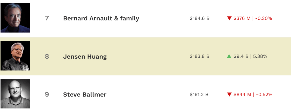 富豪财富排名 - 伯纳德·阿诺特及家族以1846亿美元财富位列实时富豪榜第7位,财富单日减少376亿美元,降幅020% [1] - 黄仁勋以1838亿美元财富位列实时富豪榜第8位,财富单日增加94亿美元,增幅538% [1] - 史蒂夫·鲍尔默以1612亿美元财富位列实时富豪榜第9位,财富单日减少844亿美元,降幅052% [1] 财富变动驱动因素 - 英伟达股价上涨是推动黄仁勋财富增长的主要因素 [1] - 黄仁勋个人财富在过去一个交易日内增长超过80亿美元 [1]