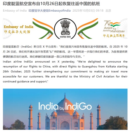 据印度驻华大使馆最新消息,印度靛蓝航空宣布自10月26日起恢复往返中国的航班,将开通从加尔各答 直飞广州的航线。 小编在航旅纵横App查询了解到,此前从印度加尔各答飞往中国广州的航线均需中转,中转地包括吉隆 坡、新加坡、曼谷等。航班总时长最短近9个小时,最长达23个小时。若实现直飞,按照航程估算,整 个航行时间将缩短至6小时以内。 据悉,靛蓝航空公司是是印度最大的私营低成本航空公司,成立于2006年,同年8月4日首飞。靛蓝航空 的航线网络已遍布全球超过110个目的地,拥有一支超过360架飞机的机队,包括多种型号的空客客机, 如A320、A320neo和A321系列。 图片来源:公司官网 昨日晚间,印度驻华大使馆发文称,中印直航将于2025年10月底前恢复,具体实施以两国指定航空公司 的商业决策为准。 中国外交部发言人林剑在8月14日表示,中印两国总人口超过28亿,恢复中国内地同印度直航有利于便 利双方人员往来和交流合作。中方同印方就此保持密切沟通,持续推动尽早恢复直航。 2020年初,中印间直航停止,至今已超过5年。 责任编辑:杨赐 ...
