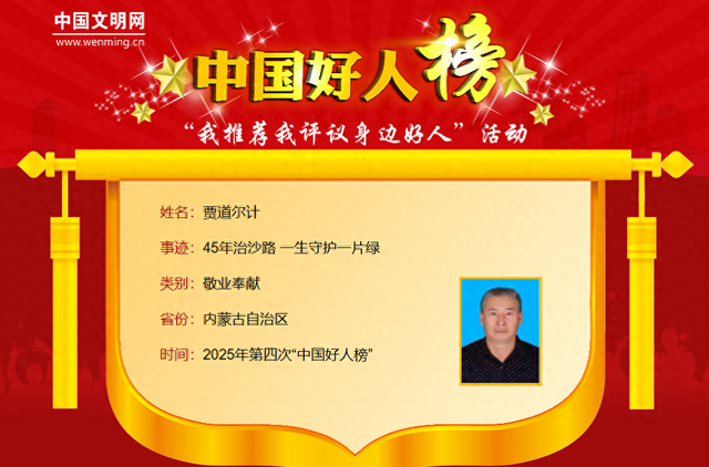 中国好人榜内蒙古上榜者事迹 - 2024年1月23日,“中国好人榜”发布仪式在四川省宜宾市举办,共有139名身边好人光荣上榜 [1] - 上榜者来自助人为乐、见义勇为、诚实守信、敬业奉献、孝老爱亲五个类别 [1] - 内蒙古的贾道尔计被评为敬业奉献好人,沈国江被评为孝老爱亲好人 [1] 敬业奉献好人贾道尔计事迹 - 贾道尔计退休前曾任鄂尔多斯市伊金霍洛旗国有林场霍洛分场哈拉沙作业区护林员、队长 [3] - 他从19岁起投身毛乌素沙海治沙工作,持续45年 [3] - 他徒步近10万公里,亲手栽下百万余株苗木,让7万亩流沙变成了绿洲 [3] - 他曾获“全国优秀护林员”等荣誉 [3] 孝老爱亲好人沈国江事迹 - 沈国江是乌海市消防救援支队海勃湾区消防救援大队滨河消防救援站一级消防长 [5] - 他悉心照料三度患癌的岳母,并照顾小腿粉碎性骨折的岳父 [5] - 他常年奔走于四川、内蒙古两地,照料独居四川的父亲,并抚养侄女考上大学、成家立业 [5] - 他曾获全国模范退役军人、内蒙古自治区道德模范、“最美消防指战员家庭”等荣誉 [5]