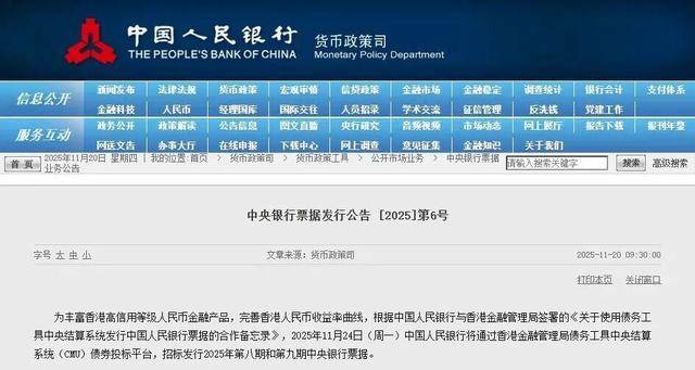 第九期中央银行票据期限1年,为固定利率附息债券,每半年付息一次,发行量为人民币150亿元,起息 日为2025年11月26日,到期日为2026年11月26日,到期日遇节假日顺延。 以上两期中央银行票据面值均为人民币100元,采用荷兰式招标方式发行,招标标的为利率。 来源:中国人民银行 11月20日,中国人民银行官网发布中央银行票据发行公告[2025]第6号。 | 中国人民银行 | | | THE PEOPLE'S BANK OF CHINA | 货币政策司 Monetary Policy Department | | | | | | | | --- | --- | --- | --- | --- | --- | --- | --- | --- | --- | --- | | 信息公开 | 新闻发布 | 法律法贸 | 横市建设 | 宏观审谈 | 筒板酸浆 | 全盛市场 | 金融稳定 | 阿雷换计 | 假行会计 | 下午何快乐 | | 国际交往 党建工作 | 金融科技 | 人民币 | 经营4年 | | 人觉招录 | 学术交流 | 征储管理 | 反洗练 | | | | 巴文和荷 服装下载 服务互动 网送文告 下载中心 ...