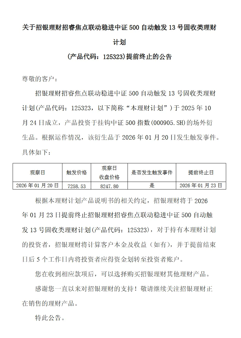 产品基本信息 - 产品名称为招银理财招睿焦点联动稳进中证500自动触发13号固收类理财计划,产品代码为125323 [1] - 该产品于2025年10月24日成立 [1] - 产品类型为固收类理财计划,投资于挂钩中证500指数的场外衍生品 [1] 产品运作与终止事件 - 根据产品说明书约定,产品于2026年1月23日提前终止 [1] - 提前终止的原因为产品挂钩的衍生品于2026年1月20日发生了触发事件 [1] 触发事件具体数据 - 触发事件的观察日为2026年1月20日 [4] - 该观察日设定的触发价格为7258.53点 [4] - 该观察日中证500指数的收盘价格为8247.80点 [4] - 由于收盘价格8247.80点高于触发价格7258.53点,满足触发条件,因此判定为“是”发生触发事件 [4]