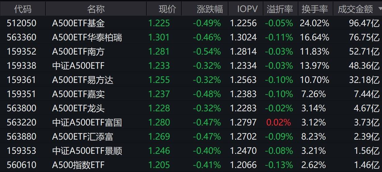 市场早盘震荡回落,中证A500指数下跌0.48%,2只中证A500相关ETF成交额超76亿元