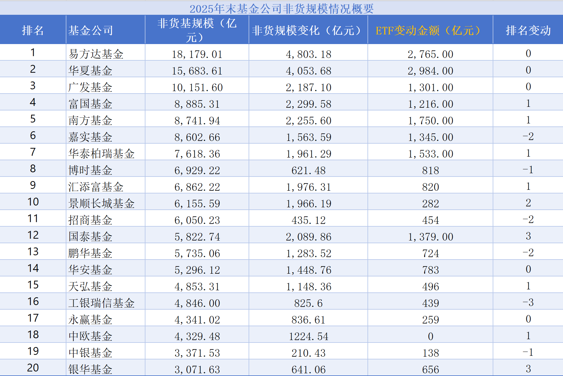 巨量增长和头部固化 追浪根据Wind数据统计,规模前十大管理人合计管理规模达15.24万亿元,占全行业总规模的40.48%。如果我们将目光投向规模增长额,会发现更加惊人的 集中度。在全市场164家有可比数据的基金公司中,有14家公司的非货规模增量超过千亿元,这14家公司合计增量超过2.1万亿元,几乎拿走了市场的大部分 增量。 | | | | 2025年末基金公司非货规模 | | --- | --- | --- | --- | | 排名 | 基金公司 | 非货基规模(亿 ル) | 非货规模变化( | | 1 | 易方达基金 | 18, 179. 01 | 4, 803. 18 | | 2 | や夏基金 | 15, 683. 61 | 4, 053. 68 | | 3 | 广发基金 | 10, 151. 60 | 2, 187. 10 | | ব | 富国音等 | 8.885.31 | 2, 299. 58 | | ട | 南方基金 | 8,741.94 | 2, 255. 60 | | 6 | 嘉实基金 | 8, 602. 66 | 1,563.59 | | 7 | 华泰柏瑞基金 | 7,618.36 | 1, ...