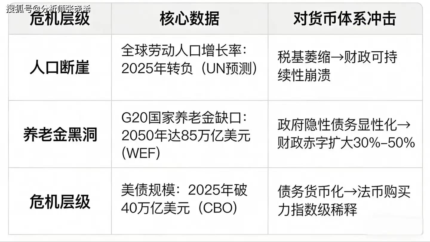 张尧浠:我们正站在新旧文明周期的断层线上,黄金未来无法想象的价格是对于货币体系的重置和再次校准 黄金虽然是抗通胀工具,但历史上真正的暴涨牛市,其实都发生在货币体系失效时刻,而不是经济衰退。所以黄金的本质,是从资产定价到货币体系"压力 计"。 2008年QE开启法币无锚时代(全球央行资产负债表扩张4倍,金价从680→ 1921美元) 共性:黄金价格跃升幅度(10-30倍)远超通胀率(2-3倍),证明其核心驱动是货币信用重估而非单纯抗通胀。 所以,通胀只是表象;未来全球经济面临的真正的危机是:人口老化、养老金破产和主权债务失控三大相互关联的结构性挑战,它们共同加剧了财政可持续 性和货币体系的长期风险。 那么,按目前全球债务规模,如果黄金重新覆盖全球货币 10–20%(非常保守): 黄金的合理区间不是 5000 或 8000,而是 15000–60000 美元。 你以为是牛市,其实是旧体系的葬礼。 所以,未来不是金价要上涨到多少会很夸张,而是对货币体系的重置。 以前黄金的上涨,是资产的价格,未来黄金价格的升高,则是货币体系本身的重新定价。 回顾历史规律验证;1933/1971/2008三次黄金价格跃迁,均对应货币信 ...