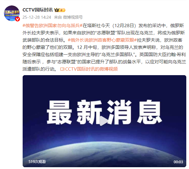 本文转自【CCTV国际时讯】; 在塔斯社今天(12月28日)发布的采访中,俄罗斯外长拉夫罗夫表示,如果来自欧洲的"志愿联盟"军队 出现在乌克兰,将成为俄罗斯武装部队的合法目标。拉夫罗夫说,欧洲政客的野心蒙蔽了他们的双眼。 12 月中旬,欧洲多国领导人发表声明称,对乌克兰的安全保障应包括组建一支由欧洲主导的"乌克兰多 国部队"。英国国防大臣约翰·希利随后表示 ,参与"志愿联盟"的国家已提升了部队的战备水平,以应对 可能向乌克兰派遣部队的行动。 ...