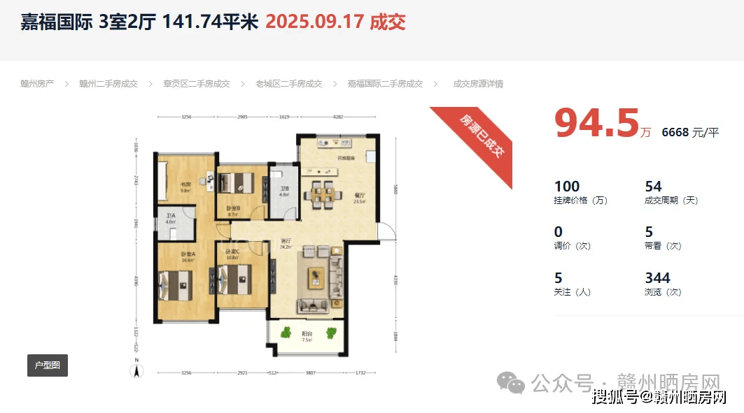 小区近期成交概况 - 嘉福国际小区于2025年9月17日成交一套建筑面积141.74平米的二手房,为时隔两年后该平台上的首笔成交[1] - 该套房源挂牌价100万,最终降价5.5万,以总价94.5万、单价6668元/㎡成交,成交周期54天[1] - 此次成交单价6668元/㎡刷新了该小区在平台上的历史最低记录[5][24] 历史成交价格对比 - 2023年5月30日成交一套62.65平米房源,总价49.9万,单价7965元/㎡,成交周期仅1天[4][24] - 2019年至2022年成交的住宅房源单价主要集中在9000元/㎡至11009元/㎡区间[18][20][22] - 2024年全年该小区在平台上无成交记录,2023年起价格和成交量均呈现下降趋势[23] 当前市场供需与挂牌情况 - 目前该小区在平台上有96套房源挂牌在售,近90天内仅1套成交,近30天带看28次[11][13] - 在售房源挂牌单价区间为4560元/㎡至11795元/㎡,总价区间为22.8万至180万[13] - 建筑面积约140平米左右的户型,挂牌单价在7882元/㎡至10715元/㎡,总价110万至155万[13][17] 小区基本面与区域市场环境 - 嘉福国际是赣州市老城区房龄较新的大型现代化小区,总建筑面积32万方,总户数957户,于2012年底或2013年初首开,折后均价6500元/㎡[5][7] - 小区自带商业体量达13万方,但商业运营状况一直不佳,较为冷清[9] - 城市发展重心外移,章江新区、蓉江新区等新兴板块分流了老城区的购房需求,导致老城区房地产市场活跃度降低[26]