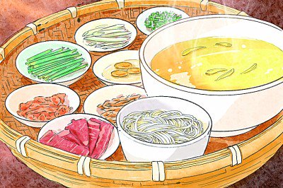 (来源:光明日报) 转自:光明日报 蒙自米线 周艺珣 绘 【至味人间】 "云南十八怪,过桥米线人人爱。"从清晨到深夜,一碗米线贯穿云南人的一日三餐:早点是它,正 餐是它,夜宵若再来上一碗热乎乎的米线,那叫一个过瘾!凉、烫、卤、煮、炒,云南米线吃法花样 多。种类更是多样,小锅米线、豆花米线、罐罐米线、过桥米线,各有各的讲究。其中历史最悠久、被 誉为"中华名小吃"的,便是蒙自过桥米线。 走,甩(吃)米线克(去)! "老板,来上一碗过桥米线!"中午时分,蒙自街边的餐馆里,早就挤满了寻味的老饕。 不久,只见店伙计端来一个形似"小桥"的木质盘,上面摆满盛有各式配菜的小碟。紧接着,一只口 径约莫22厘米的大陶瓷碗,稳稳地落在老旧的木桌上。在食客还在惊叹大碗之大时,店伙计笑着说 道:"先生后熟,最后下米线。" 碗里盛着热气腾腾的汤,上面浮着一层黄澄澄的猪油;旁边十余个巴掌大的小碟里,装着新鲜的鹌 鹑蛋、里脊肉片、鱼肉片、土鸡肉、炸猪皮、炸酥肉、豌豆尖、豆芽、豆腐皮、豌豆坨、草芽……色彩 缤纷,宛如精致的颜料盘。 "成品的汤出锅后,要在上面浇一层热猪油,一是增香,二是锁温。高汤中心温度需在95摄氏度以 上,才能瞬间烫熟食材, ...
