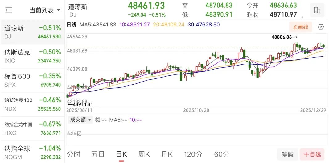 美股年末行情与结构性变化 - 2025年末美股出现小幅回落,市场内部结构性变化显现,此前推动创新高的科技股开始走弱,成为年末重要变量 [1] - 标普500指数年内涨幅超过17%,有望实现连续第八个月上涨,但12月29日主要股指收低,以疲软基调开启最后一周行情 [3] - 年末交易清淡,投资者趋于谨慎,之前快涨板块率先回调,市场回调更像是年末节奏调整,而非市场方向的根本改变 [3][6] 科技股表现与市场情绪 - 估值较高的大型科技股成为主要拖累,例如英伟达下跌约1.2%,博通下跌约0.8%,对指数形成明显压力 [5] - 科技股在11月已整体走弱,12月以来涨幅有限,随着市值快速上升,投资者情绪变得更加谨慎 [6] - 市场内部结构变化,资金更加分散,不再集中押注单一热门板块 [6] 人工智能(AI)板块市场态度转变 - 相比年初对AI长期前景的高度热情,投资者现在更关心企业能否赚钱、AI投入成本以及投入何时转化为实际现金流 [6] - AI相关股票近期多次拖累纳斯达克指数和华尔街整体表现,反映出市场对高估值科技股态度谨慎,对AI题材依赖度下降 [7][8] - 博通财报不疲弱,AI业务仍保持增长,但股价明显回调,表明投资者不再单纯依据AI前景买入,而是更谨慎评估估值与回报周期 [8] 对AI泡沫的担忧与分歧 - 多家主流媒体表达对AI是否属于市场泡沫的担忧,彭博社把泡沫风险列为2025年最重要的交易主题之一,AI被反复提及 [9] - 尽管存在泡沫担忧,部分投资者依旧在购买AI股票,表明市场对未来增长仍保有乐观预期 [10] 2026年市场展望与预测 - 华尔街策略师普遍预期美股将继续上涨,但预测增长幅度明显低于近年水平,上涨行情将不再局限于少数几只市值巨大的科技股 [11][12] - 对纳斯达克综合指数的预测更具争议性,乐观预测显示,若AI应用持续强劲增长且基础设施支出转化为营收,该指数有望实现10%至15%的回报率 [13] - 预计到2026年,主要科技公司的资本支出将接近5200亿美元,反映出对AI和云计算扩张的持续投入 [13] - 支持者认为这些投资将推动长期生产力并支撑估值,怀疑者警告短期盈利可能低于预期,收入增长可能跟不上投资者乐观情绪 [13] - 多家资产管理公司预计未来五到十年美国成长股回报将较为平淡,更青睐价值型股票、优质固定收益产品和国际市场 [13]