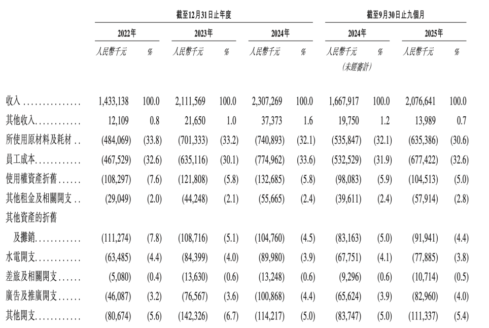 来源丨凤凰网财经《IPO观察哨》 近日,巴奴更新招股书。 这个一直以"品质"为标签的火锅品牌,以毛肚+菌汤为特色,过去曾因价格昂贵、产品问题、创始人言论而陷入争议。在今年首次递 交招股书后,巴奴就曾收到证监会"九连问",直指公司突击分红及用工合规等问题。 从成本结构来看,巴奴的原材料和员工成本,这两块最大的成本(合计超6成),均在被"压缩"。 首先是原材料及耗材占比明显缩小,2022年到2024年,原材料及耗材,占收入的比例为33.8%、33.2%、32.1%,在2025年前9 个月,再下降至30.6%,为近年来的低点。 | | | | 截至12月31日止年度 | | | | | 截至9月30日止九個月 | | | | --- | --- | --- | --- | --- | --- | --- | --- | --- | --- | --- | | | 2022年 | | 2023年 | | 2024年 | | 2024年 | | 2025年 | | | | | | 人民幣千元 | | | | | 9 % 人民幣千元 % % 人民幣千元 % | | | | | | | | | | | (未經審計) | | ...