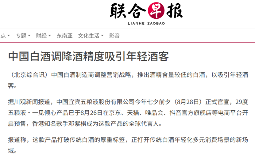 报道还提到,低度白酒市场规模从2020年约200亿元(人民币,下同,36亿新元)增至2024年约570亿元;中国酒业协 会执行理事长王琦预测,2025年中国低度酒饮市场规模将突破740亿元。 【环球网财经综合报道】贵州省拟发文推动"卖酒"向"卖生活方式"转变,提出要深入实施"白酒+"产业融合行动,深入 实施"白酒+"文体融合行动,制定白酒出口三年行动计划和目录指引。 万联证券近日发布研报分析认为,目前白酒行业处于去库存阶段,2025年业绩放缓是酒企不得不面临的阵痛,且2025 年3季度酒企加大了去库存力度,但企业也在不断进行产品创新、渠道精耕和数字化转型的新探索,为库存出清后的 新一轮发展蓄能。 《联合早报》则发文称,中国白酒制造商为了吸引年轻消费者,正在调整营销策略,推出酒精含量在26至29度的低度 白酒产品;低度化契合新生代追求微醺和健康的需求,市场反应良好。 ...