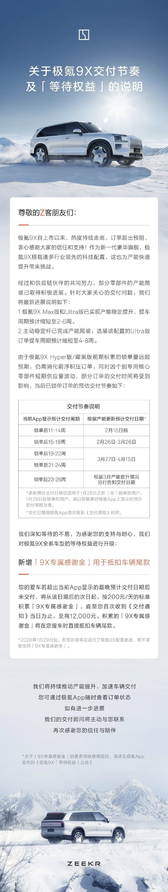 公司产品市场表现与定位 - 极氪9X自上市以来,已连续两个月位居50万级以上大型SUV市场销冠 [1][6] - 极氪9X单车交付均价超过53万元 [1][6] - 产品定位为新一代豪华旗舰,搭载诸多行业领先的科技配置 [1][3][6][8] 产品交付现状与产能挑战 - 由于搭载领先科技配置,为产能快速提升带来了挑战 [1][3][6][8] - 经过与供应链伙伴共同努力,部分零部件的产能爬坡已取得积极进展 [1][3][6][8] - 极氪9X Max版和Ultra版提车周期已缩短至2-6周 [1][3][6][8] - 选装智能主动稳定杆的Ultra版交付周期为4-8周,该部件已完成产能爬坡 [1][3][6][8] - Hyper版与曜黑版交付周期缩短了4周,但因前期锁单量远超预期,仍需消化大量前序积压订单,交付还需一定时间 [1][3][6][8] 具体车型交付节奏更新(针对1月28日及之前锁单用户) - 当前App显示锁单后11-14周交付的订单,预计交付日期更新为2月15日前 [3][8] - 当前App显示锁单后15-18周交付的订单,预计交付日期更新为2月26日至3月26日 [3][8] - 当前App显示锁单后19-22周交付的订单,预计交付日期更新为3月27日至4月15日 [3][8] - 对于锁单后23-26周交付的订单,将根据3月产能提升情况另行告知交付日期 [3][8] 公司推出的客户等待权益政策 - 为应对持续火爆的订单和大量等车用户,公司推出“9X专属感谢金”等待权益 [1][4][6][9] - 若车辆交付超过极氪App显示的最晚预计交付日期,将从次日起按200元/天的标准积累感谢金,直至交付通知当日 [1][4][6][9] - 累积的感谢金金额最高为12,000元,可在提车时直接抵扣车辆尾款 [1][4][6][9] - 该权益适用于极氪9X全系车型 [3][8] - 自2026年1月29日起,若用户在锁单后进行车辆配置更改,将不再享受任何专属感谢金 [4][9]