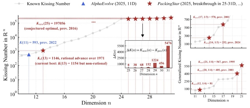 核心观点 - 上海科学智能研究院联合北京大学、复旦大学研发的PackingStar强化学习系统,在亲吻数问题上取得跨维度的系统性突破,验证了AI参与高维数学结构系统性探索的新型人机协同研究路径 [1] 研究突破与成果 - PackingStar系统在12、13、14、17、20、21以及25至31维等多个维度刷新了亲吻数与广义亲吻数纪录,实现了跨维度、成体系的推进 [1] - 此次突破是AI在高维组合几何和编码理论中的首个系统性突破,在亲吻数问题三百年历史中,如此规模的跨维度连续推进极为罕见 [1] - 团队发现了多维度持平纪录的非对称构型,突破了传统对称构造思路 [5] 方法论与技术创新 - PackingStar重新定义了问题,将高维几何难题转化为代数计算,形成了跨维度迁移路径,克服了此前方法(如DeepMind的AlphaEvolve仅实现11维单点优化)难以普适的局限 [5] - 团队形成了稳定的人机协作模式:人类提出研究边界,AI高速构造搜索,人类验证抽象结果,使高维几何探索从单点尝试走向系统推进 [5] - 通过自研底层算子、优化GPU计算流程、建立自动Checkpoint机制,实现了千卡级任务断点续传,搜索速度提升数倍,累计节省超过10万GPU卡时 [5] 工程体系与平台支撑 - 研究院以开放平台拆解科学目标,以工程能力对冲探索不确定性 [5] - 上智院、复旦大学与无限光年联合研发的星河启智科学智能开放平台,已沉淀PackingStar的关键算子与方法,为新材料、药物发现等高维优化领域提供智算支撑 [5] 问题背景与意义 - 亲吻数问题源于1694年牛顿与格雷戈里的争论,是希尔伯特第十八问题的局部形式,关联格子理论、球面码等数学分支,并与卫星通信、量子编码、数据压缩等工程技术紧密相关 [1] - 高维空间中的亲吻数问题迅速进入研究“无人区”,过去50年该领域仅7次实质性进展,且方法难以迁移复用 [2] - 2022年,数学家玛丽娜·维亚佐夫斯卡因8维与24维球体堆积最优解证明获菲尔兹奖,凸显了该领域的重要性 [1]