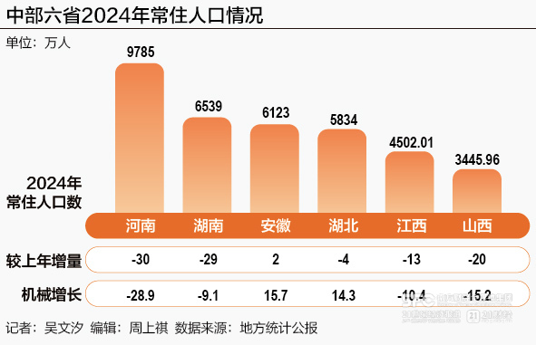 中部六省2024年人口总体数据 - 截至2024年末,中部六省常住人口分别为:河南9785万人、湖南6539万人、安徽6123万人、湖北5834万人、江西4502.01万人、山西3445.96万人 [1] - 相比2023年,仅安徽实现人口正增长,增加2万人;湖北、江西、山西、湖南、河南分别减少4万人、13万人、20万人、29万人、30万人 [1] - 2024年中部地区占全国人口的比重为25.73% [6] 人口机械增长(流动) - 2024年安徽、湖北两省分别流入15.7万和14.3万人口,实现人口机械正增长 [1][5] - 自2020年第七次全国人口普查以来,安徽常住人口增长18万人,湖北四年间实现89万人的人口增量 [3][5] - 中部省会城市中,合肥、长沙、南昌、武汉2024年常住人口分别正增长14.9万人、10.34万人、10.22万人、3.51万人 [7] 人口自然增长 - 2024年河南出生率为7.78‰,出生人口76.2万人,位居全国第二,自然增长率在中部地区位居第一 [3][6] - 河南自然增长率明显高于全国平均水平 [3] 产业与经济发展对人口的影响 - 安徽战略性新兴产业产值占规模以上工业比重达43.6%,高技术制造业增加值增长22.3% [3] - 2024年湖北省GDP突破6万亿元,经济增速与安徽持平,在中部地区位居前列 [5] - 合肥2024年新能源汽车产量达137.6万辆,同比增长84.5%,超越上海跃居全国第二 [8] - 河南除郑州外,其余城市经济发展不突出,且高技术、高附加值产业缺乏比较优势,对年轻人口吸引力不足 [6] 区域战略与跨区域协作 - 安徽地处中部崛起和长三角一体化两大战略交界处,承接长三角资源外溢和产业分工 [3] - 合肥被定位为长三角地区重要中心城市,牵头组建长三角人工智能、新能源汽车等4个产业联盟,串联1100多家长三角重点企业 [8] - 南昌、太原在城市规划中分别提出对接长三角一体化、粤港澳大湾区建设和深度融入京津冀协同发展 [9] - 中部地区需与东、西部省份进行产业融合,寻求产业分工,形成独特优势以避免同质化竞争 [9] 人口与人才政策 - 湖北深度放开放宽城市落户限制,取消除武汉外全省其他地区落户限制,降低武汉市落户门槛 [9] - 河南郑州2023年发布落户新政,中心城区有稳定就业或住所即可落户,省内其他城市已全面取消落户限制 [9] - 湖北启动“十百千万”行动,计划用3~5年培养引进10名战略科学家、100名科技领军人才等 [10] - 河南计划开发人工智能应用就业岗位6万个以上,促进不少于4万人在该领域就业创业 [10] 面临挑战与发展方向 - 产业留人成效不足、省内缺乏有全国竞争力的人口增长极是中部省份普遍困境 [3][7] - 河南人口持续流出,2024年常住人口较七普峰值9941万人减少近156万人 [6] - 人口增长和高质量发展的核心是依靠产业留人,就业是人口集聚的重要条件 [7] - 吸引人口需在住房、户籍、就业等方面提供便利,并优化鼓励生育政策,将人口既视为劳动力也视为消费者 [10]