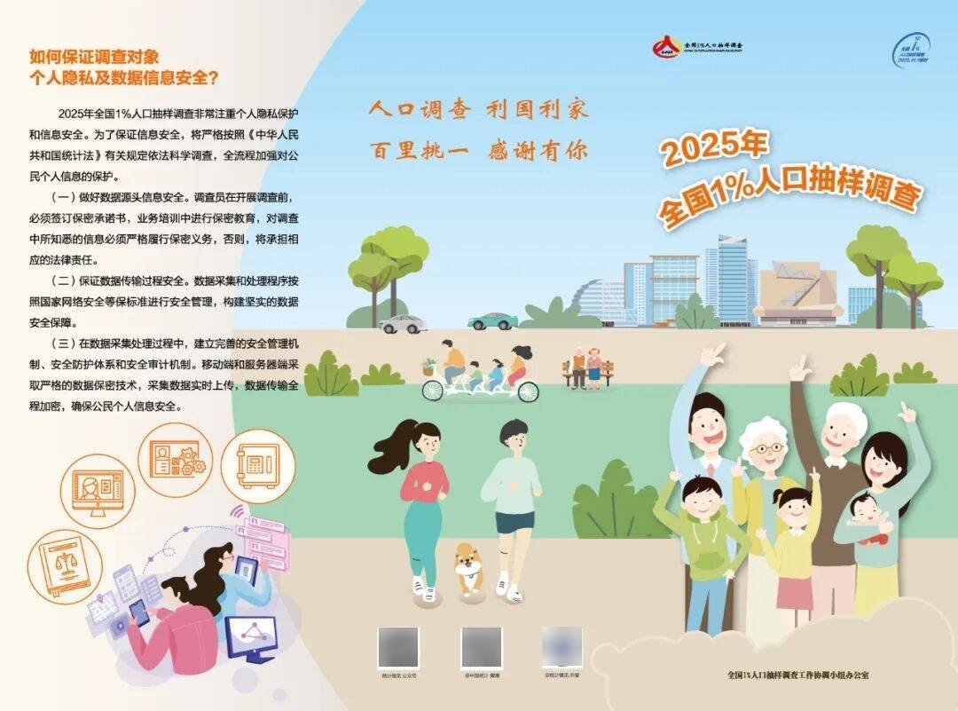 调查基本信息 - 2025年全国1%人口抽样调查于11月1日启动,现场登记工作为期一个月 [2] - 调查目的是全面准确掌握2020年以来中国人口在数量、素质、结构、分布及居住等方面的变化情况 [4] - 调查对象为中国境内抽中住户的全部人口,包括调查时点在家和户口在但人不在的人口,全国共抽取约500万住户、1400万人 [7]   调查目的与意义 - 调查为科学制定国民经济和社会发展规划、完善人口发展战略、推动人口高质量发展提供统计信息支持 [4] - 通过了解人口结构和分布,为公共服务基础设施布局和建设提供依据,推动公共资源精准分配 [5] - 调查有助于应对学龄人口变化、交通规划、公共服务配置及养老服务设施完善等具体挑战 [5]   调查实施方式 - 被抽中住户由政府选聘的调查员上门进行调查,住户需根据询问申报信息 [8] - 调查同时提供自主填报方式,公众可使用移动终端扫描二维码自行联网申报个人和家庭信息 [8] - 调查依据《全国人口普查条例》规定,在两次人口普查之间、尾数逢"5"的年份进行 [4]   数据安全与阶段划分 - 调查严格按照《中华人民共和国统计法》依法进行,全流程加强对公民个人信息的保护 [10] - 通过保障数据源头安全、数据传输过程安全及建立完善的数据采集处理安全机制来保护信息安全 [10] - 调查主要分为准备阶段(2024年9月-2025年10月)等多个阶段进行 [10]