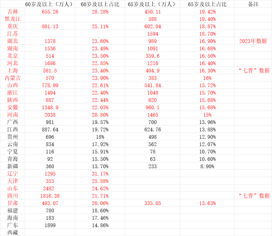 在这20个省份中,有12个来自北方地区 云南统计局发布,2024年末,云南全省常住人口4655万人,其中,60岁及以上人口834万,占常住人口的比重为17.9%;65岁 及以上人口562万,占常住人口的比重为12.1%。根据这组数据,虽然云南还没有进入中度老龄化,但是从老年人口增长趋势 来看,未来几年将加速进入中度老龄化。 从历史数据来看,近年来,老龄化程度持续加快。2018年,全国仅有辽宁、上海、山东、四川、江苏和重庆等6个省份65岁人 口已经超过14%,即进入中度老龄化阶段。只过了7年时间,进入中度老龄化的省份就增长了两倍多。 其实,梳理各省份2024年的统计公报及其他渠道发布的官方数据来看,目前,全国已经有20个省份进入了中度老龄化阶段。 | | 60岁及以上(万人) | 60岁及以上占比 | 65岁及以上(万人) | 65岁及以上占比 | 备注 | | --- | --- | --- | --- | --- | --- | | 吉林 | 655. 26 | 28. 28% | 450. 11 | 19. 42% | | | 黑龙江 | | | 588 | 19. 40% | | | 重庆 | 801. ...