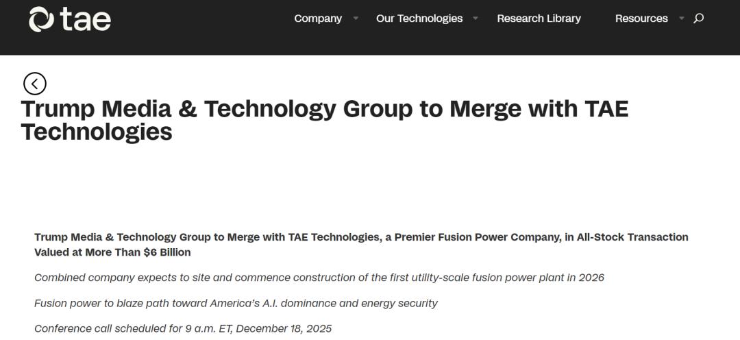 特朗普媒体与科技集团(DJT)与Alphabet支持的核聚变能源公司TAE Technologies达成全股票交易合并,交易总价值超过60亿美元。 当地时间周四,特朗普媒体与科技集团(DJT)已同意与一家获得Alphabet支持的核聚变能源公司进行全股票交易合并,交易总价值超过60亿美元。此次合 并将使双方共同建设一系列大型聚变发电厂,以满足人工智能(AI)浪潮带来的能源需求。美股早盘,DJT股价大幅飙升,涨幅一度接近40%。 根据协议,交易完成后,特朗普旗下的媒体公司与TAE Technologies的股东将各自拥有合并后公司约50%的股份。交易预计于2026年年中完成,每股TAE 股票定价为53.89美元。 合并后的公司计划于2026年选址并开始建设"全球首座公用事业规模聚变发电厂",初期发电能力为50兆瓦,需获得相关审批。未来将建设更多聚变电厂, 整体发电能力预计在350至500兆瓦之间。 DJT首席执行官德文·努内斯表示,此次交易将使公司向"革命性技术迈出重要一步,确保美国在全球能源领域的长期领先地位"。 根据协议,DJT将在签约时向TAE提供最高2亿美元现金,并在首次提交注册文件时再追加1亿美元,该 ...