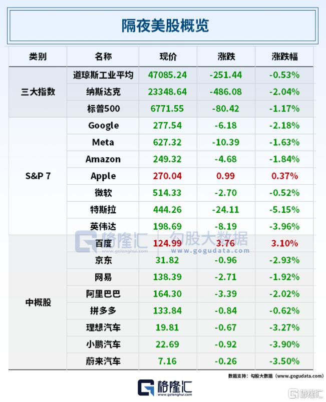 美国国会参议院11月4日再次未能通过联邦政府临时拨款法案,联邦政府"停摆"进入第35天,追平史上最 长纪录。两党僵局导致空管人员缺口达2000-3000人,航空运输受严重冲击。美交通部长达菲警告,若航 空系统因停摆变得不安全,将关闭美国领空。国会预算办公室预计,此次停摆可能导致四季度美国GDP 年增长率下降1-2个百分点。 11月4日,商务部回应安世半导体相关争端,谴责荷兰政府9月30日发布行政令、通过法庭裁决剥夺中企 股权的行为,指出荷方10月26日停止向安世中国供应晶圆,导致其生产受阻,破坏全球半导体产供链稳 定,荷方需负全部责任。目前,中方已推出出口豁免措施推动恢复供货,但荷方未展现建设性态度。中 方呼吁荷方停止干涉企业事务,相向而行解决问题。 美股方面,三大指数集体收跌。道指跌0.53%,纳指跌2.04%,标普500指数跌1.17%。 大型科技股多数下跌,英特尔跌超6%,特斯拉跌超5%,英伟达跌超3%,谷歌跌逾2%,亚马逊、Meta跌 超1%,微软涨0.52%,苹果微涨0.37%。 热门中概股普遍下跌,理想汽车、小鹏汽车、蔚来跌超3%,阿里巴巴、京东跌超2%,网易跌1.92%,百 度逆市上涨3.1%。 ...