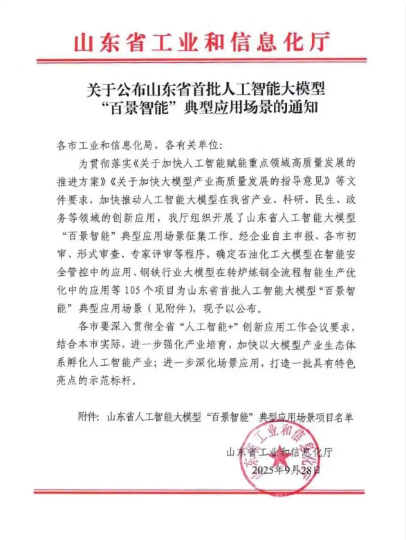 齐鲁晚报.齐鲁壹点记者吴金彪 近日,山东省首批人工智能大模型"百景智能"典型应用场景公布。由山东数字文化集团、山东齐鲁壹点传媒有限公司申报的"齐鲁文化大 模型在多模态语料构建、文化传播智能化及文旅互动、文化科技融合等场景中的应用"(简称:齐鲁文化大模型场景应用)成功入选, 为"人工智能+文旅"领域唯一。 "齐鲁文化大模型"由山东数字文化集团自主研发,以先进的大模型算法技术为根基、以自建山东文化数据库为核心训练语料、以自研多 模态内容风控平台为安全保障,是完全可控的多模态生成式人工智能模型。自2024年11月上线以来,该模型先后获得国家网信办"境内深 度合成服务算法备案"和"生成式人工智能服务备案",被写入2025年省政府工作报告和2025年数字强省建设工作要点,入选山东省最高层 次的科研项目之一——"省重大科技创新工程",获得中国信通院文化大模型专项评估5级认证,获得国家技术发明专利21个,牵头或参与 制定相关标准5个。齐鲁文化大模型不断推动在文旅、教育等行业的规模化落地,已形成可复制的技术体系与产业赋能模式,有力支撑了 国家人工智能+行业深度融合战略目标。 山东数字文化集团始终重视发挥技术的引领驱动作用,依 ...