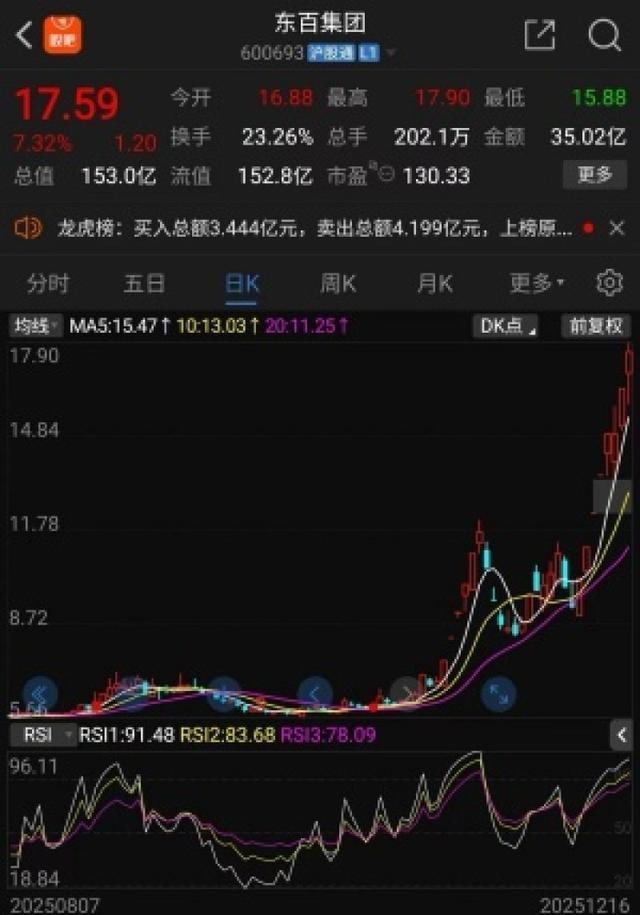 华夏时报记者 谢碧鹭 北京报道 东百集团近期股价走势 2025年末的A股市场,零售板块成为震荡行情中一道亮眼的风景线。作为一家深耕零售与仓储物流领域 的上市公司,东百集团(600693)近期凭借强劲的股价表现、扎实的业务布局和持续改善的经营数据, 成功吸引市场目光聚焦。 具体来看,自12月初以来,公司股价便开启了强势上涨通道,12月5日、8日、9日、10日、11日和15日 相继涨停,7天获得6板。截至12月16日,东百集团的股价为17.59元/股,总市值超过150亿元,当天换 手率为23.26%,市场交易活跃度显著提升。 这一行情并非孤立现象,而是多重利好因素共振的必然结果。从政策层面看,商务部近期密集释放积极 信号,提出加快推进消费新业态、新模式试点,打造"人工智能+消费"场景,"十五五"时期更明确将零 售业作为培育完整内需体系的关键着力点,为行业高质量发展注入强心剂。 主力资金加速流入 近期东百集团的股价走势堪称A股市场的"现象级"表现,短短7个交易日内相继收获6个涨停板,累计涨 幅超75%,成为零售板块当之无愧的"领涨龙头"。 这一波凌厉涨势始于12月初,随着零售板块整体升温与公司利好消息释放,资金开始 ...