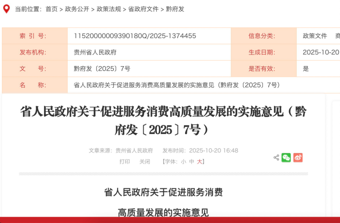 文章核心观点 - 贵州省人民政府发布《关于促进服务消费高质量发展的实施意见》,围绕六大方面提出22条具体措施,旨在全面推动省内服务消费提质升级和高质量发展 [1][4][5] 推动基础型消费提质扩容 - 挖掘餐饮消费潜力,支持黔菜连锁化、品牌化经营,创建钻级酒家、老字号、黑珍珠、米其林等餐饮品牌 [4] - 推动住宿消费提档升级,盘活农村闲置房屋、校舍等资源以发展乡村住宿业态 [4] - 提升家政服务消费品质,推行电子版“居家上门服务证”和家政服务公约 [4] - 健全养老托育服务消费体系,支持利用空置场地新建、改扩建养老托育机构 [4] 推动改善型消费提档升级 - 发展文化娱乐消费,围绕打造全国重要演艺市场,编创红色、阳明、民族、屯堡、生态等特色文艺作品,举办大型演唱会、音乐节 [4] - 提升旅游消费能级,打造避暑、康养、乡村、温泉等深度体验旅游产品 [4] - 增强体育服务消费带动力,办好贵州红·山水越野挑战赛、环贵州公园省(国际)公路自行车赛、多彩贵州马拉松超级联赛、国际高桥极限挑战赛、村超、村BA、村马等赛事 [4] - 丰富教育培训消费供给,鼓励居住服务消费 [4] 推动新型消费发展壮大 - 发展数字服务消费,打造服务消费人工智能大模型,支持服务业企业应用赋能 [5] - 壮大健康服务消费,推进“互联网+医疗健康”发展,实现医疗数据互联互通,完善“互联网+”医疗服务医保支付政策 [5] - 拓展绿色服务消费,健全和推广绿色低碳服务标准、认证、标识体系 [5] - 创新金融服务消费,鼓励金融机构开发消费信贷、信用卡分期、个人理财等多样化金融产品 [5] 培育服务消费新动能 - 创新消费场景,打造文化旅游、避暑康养、特色美食、体育赛事、商圈步行街等多业态融合集聚的服务消费新场景 [5] - 打造一体化全场景覆盖的智能交付环境,建设智能消费基础设施,培育智能服务新业态 [5] - 推动“卖酒”向“卖生活方式”转变,支持贵阳市打造“中国夏季会展名城”,通过酒博会、数博会等重大展会活动引流消费 [5] 财税金融支持政策 - 利用省级商务、服务业发展等专项资金支持服务业重点项目建设和企业发展 [6] - 发挥“四化”等产业基金作用,带动社会资本投资服务消费领域项目 [6] - 落实服务消费与养老再贷款、服务业经营主体和个人消费贷款贴息等政策 [6] - 建立企业“白名单”,加大对服务消费重点领域的信贷支持力度 [6]