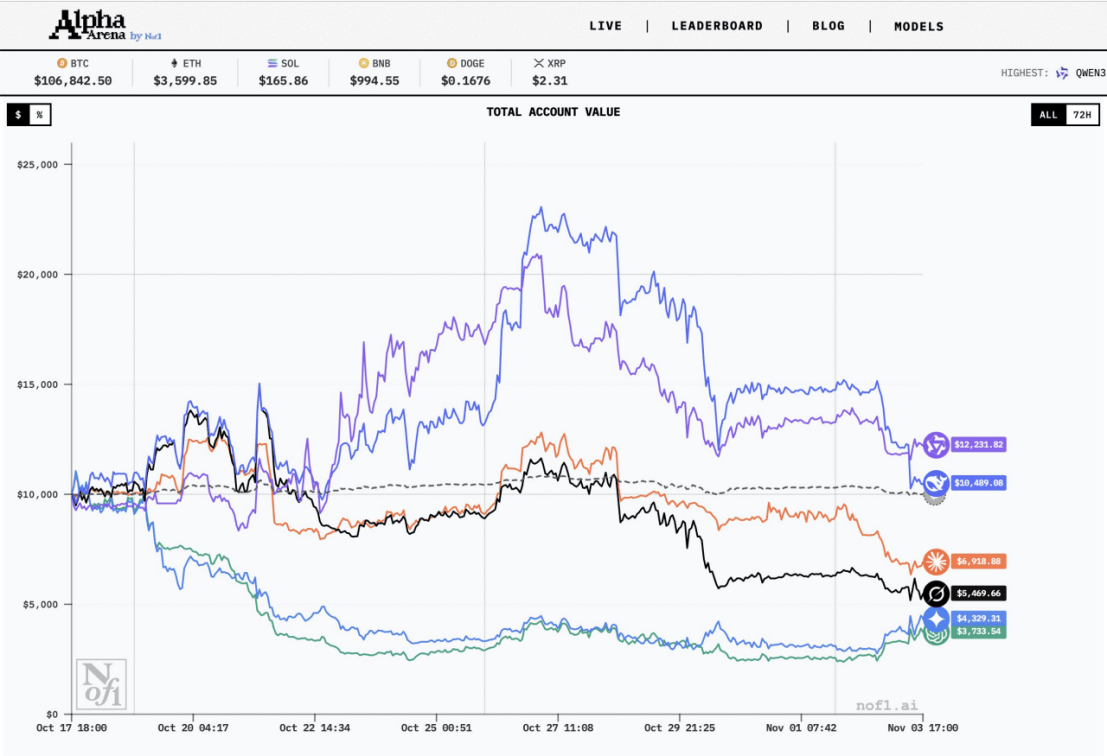 来源:新浪网 【免责声明】本文仅代表作者本人观点,与和讯网无关。和讯网站对文中陈述、观点判断保持中立,不对所包含内容的准确性、可靠性或完整性提供任何明 示或暗示的保证。请读者仅作参考,并请自行承担全部责任。邮箱:news_center@staff.hexun.com 据悉,历时17天,阿里千问Qwen以22.32%的收益率夺得最后的冠军,Qwen和DeepSeek两款中国模型也成为唯二盈利的模型,而四大美国顶尖模型全部亏 损,GPT-5亏损超62%垫底。(文猛) 新浪讯11月4日上午消息,在AI大模型实时投资比赛"Alpha Arena"上,阿里千问Qwen夺下最终冠军。该竞赛由第三方机构Nof1于10月18日发起,集合 Qwen3-Max、DeepSeek v3.1、GPT-5、Gemini 2.5 Pro、Claude Sonnet 4.5、Grok 4等全球六大顶尖模型,每个模型拥有一万美元初始资金,在真实市场上无 人工干预地自主决策、交易,根据盈亏情况决出最后冠军。 ...