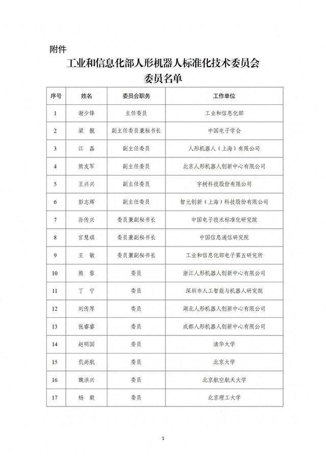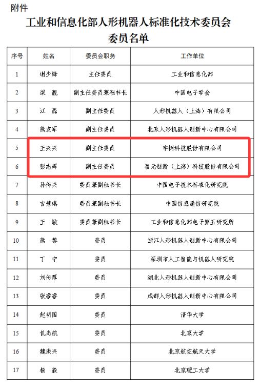 下载财联社APP获取更多资讯 准确 快速 权威 专业 7x24h电报 头条新闻 VIP资讯 实时盯盘 工信部公示人形机器人标准化技术委员会委员名单, 其中,宇树科技股份有限公司王兴兴、智元创新(上海)科技股份有限公司彭志辉均任副主任 委员。 | | | 上业科信息化部人形机奋人标准化技术安贝会 | | | --- | --- | --- | --- | | 2 | | 委员名单 | | | 序号 | 姓名 | 委员会职务 | 工作单位 | | 1 | 谢少锋 | 主任委员 | 工业和信息化部 | | 2 | 梁 觀 | 副主任委员兼秘书长 | 中国电子学会 | | ﻟﺪ | 江 覆 | 副主任委员 | 人形机器人(上海)有限公司 | | 4 | 熊友军 | 副主任委员 | 北京人形机器人创新中心有限公司 | | 5 | 王六六 | 副主任委员 | 宇树科技股份有限公司 | | 6 | 彭志辉 | 副主任委员 | 智元创新(上海)科技股份有限公司 | | 7 | 孙传兴 | 委员兼副秘书长 | 中国电子技术标准化研究院 | | 8 | 官慧琪 | 委员兼副秘书长 | 中国信息通信研究院 | | 9 | 王 敏 ...